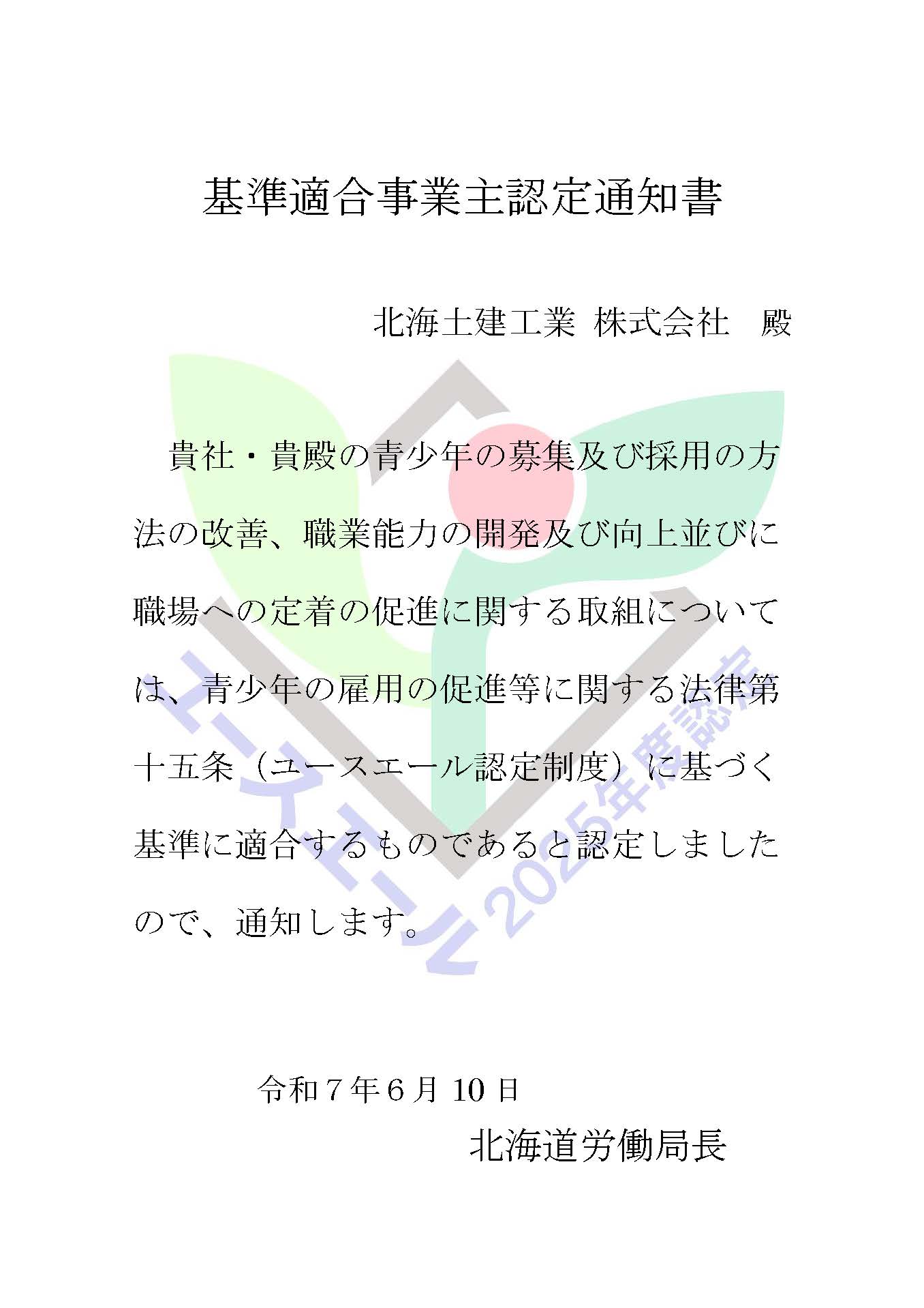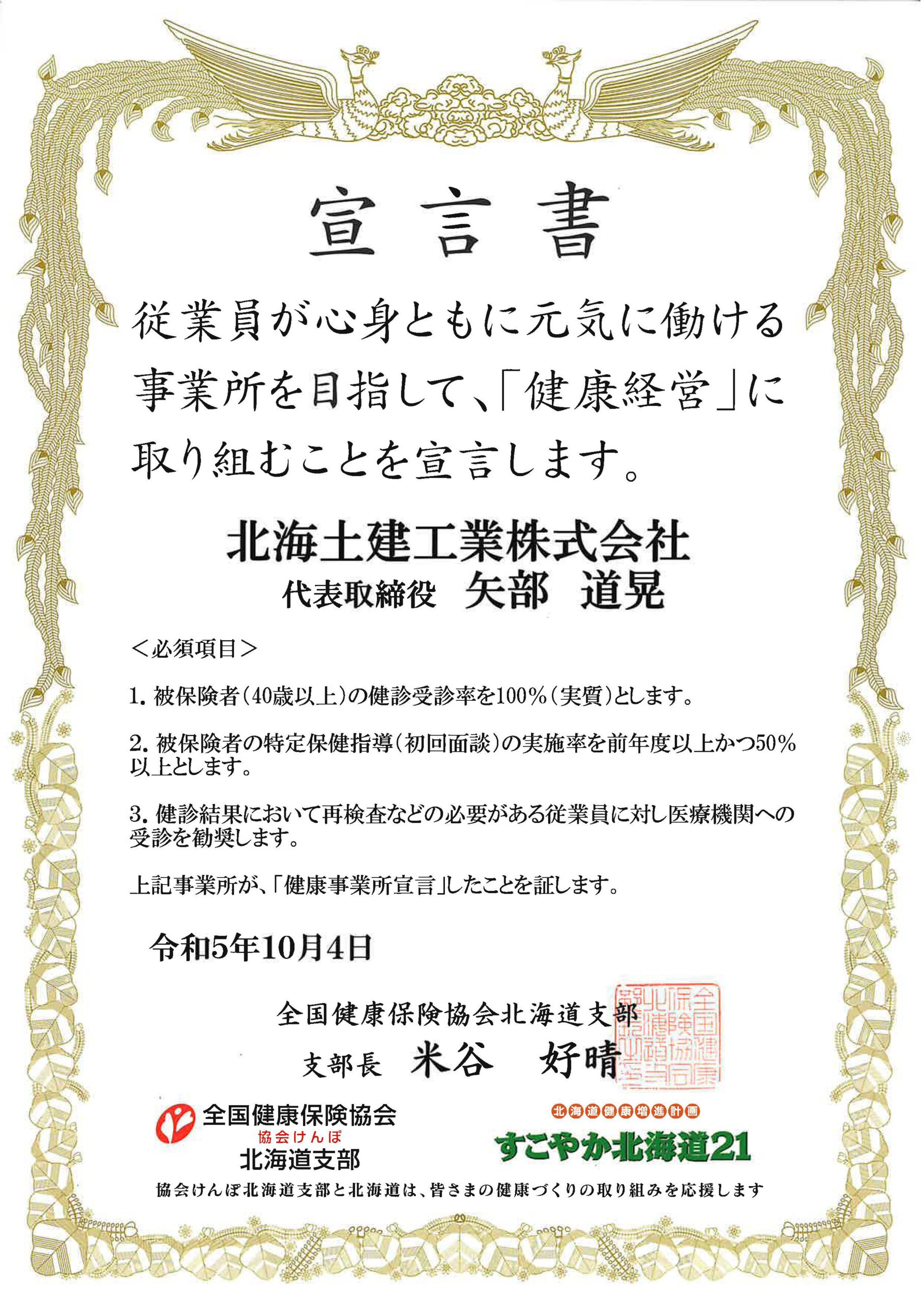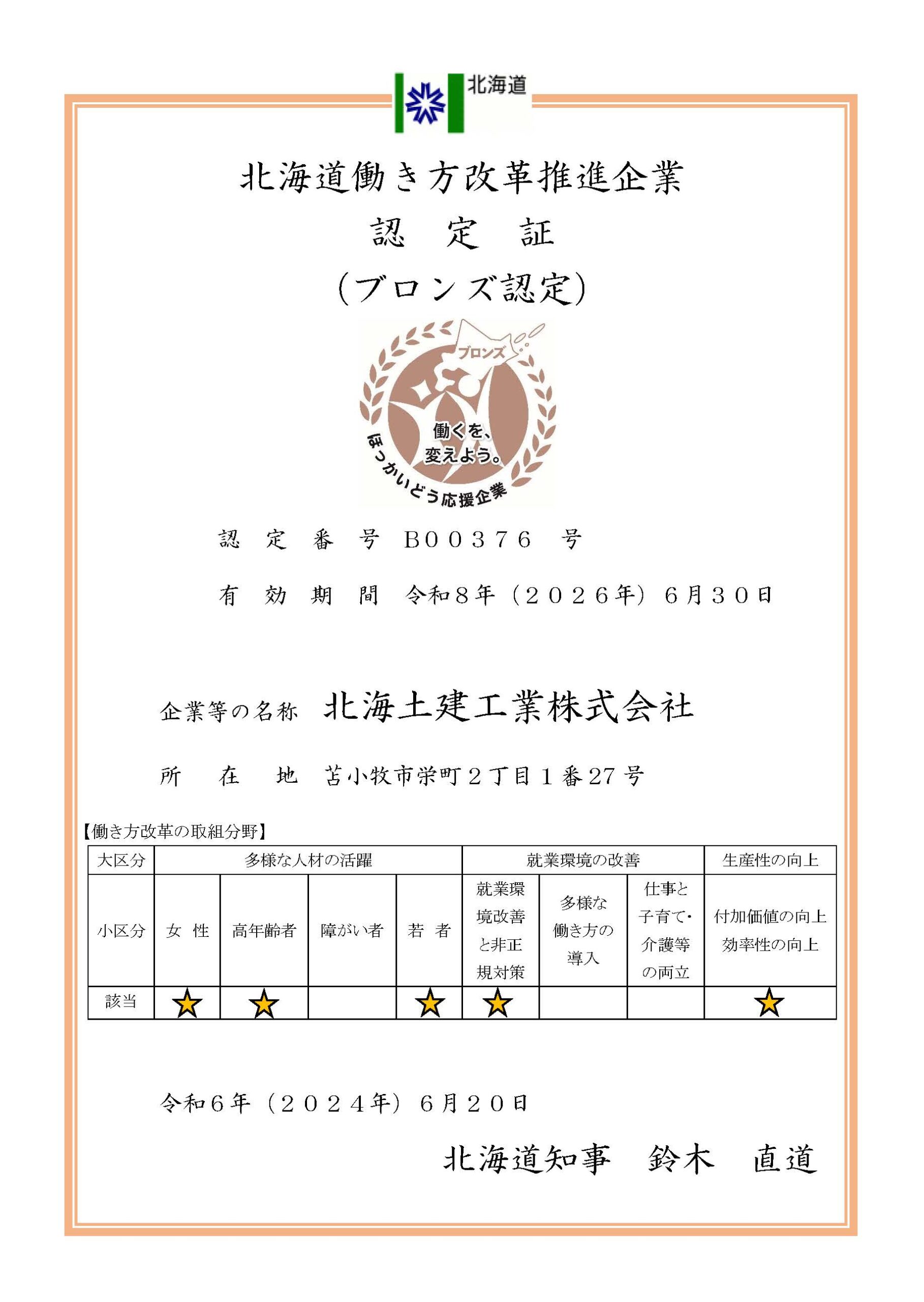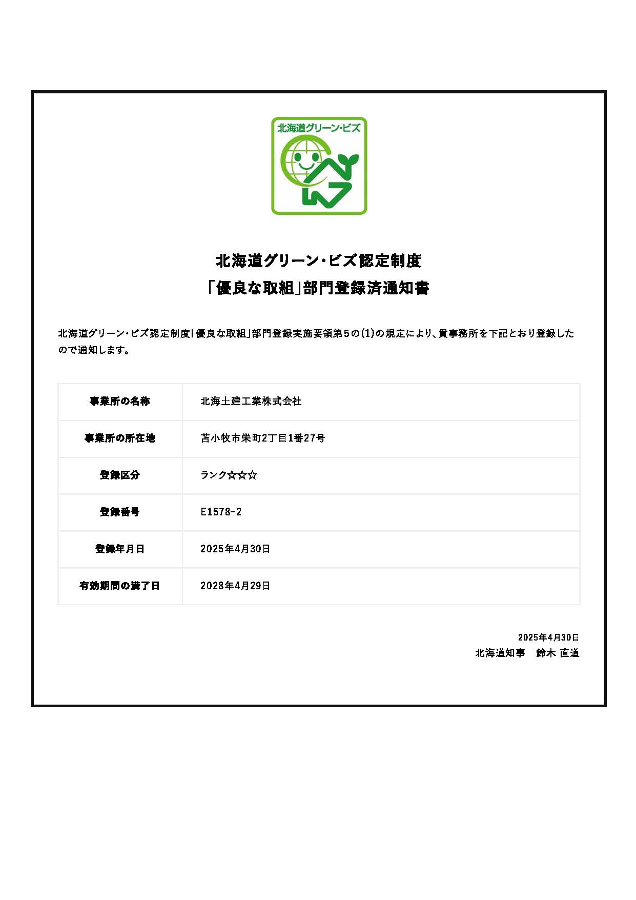 | 建設業許可 | 【許可番号】北海道知事許可(特ー4)胆第00597号 【許可業種】土木工事業/建築工事業/とび・土工工事業/舗装工事業/水道施設工事業/解体工事業 |